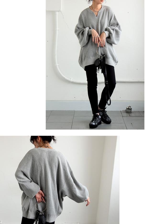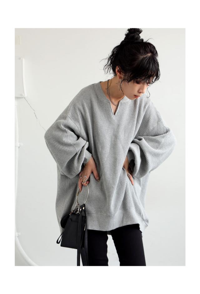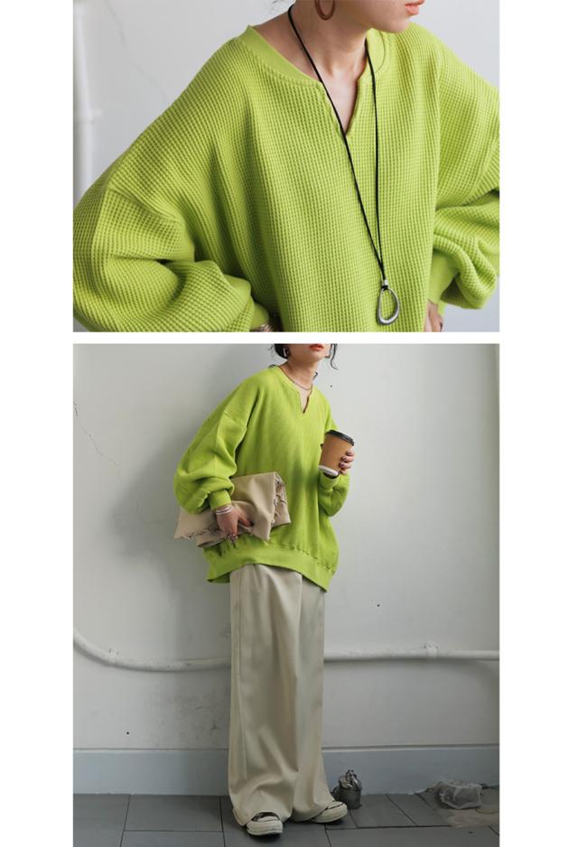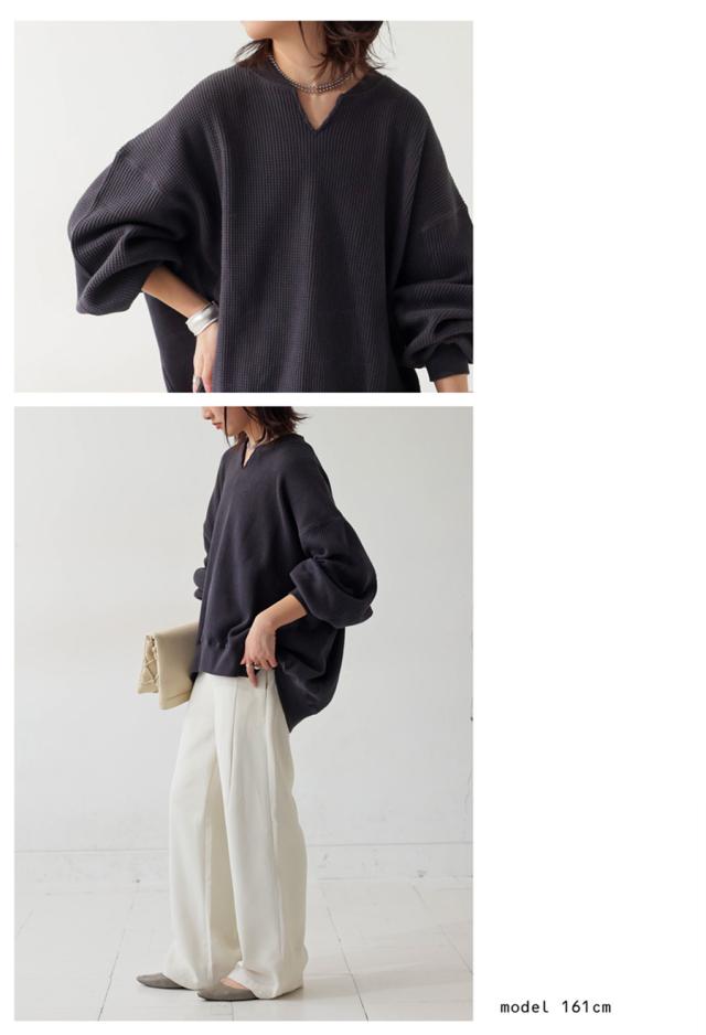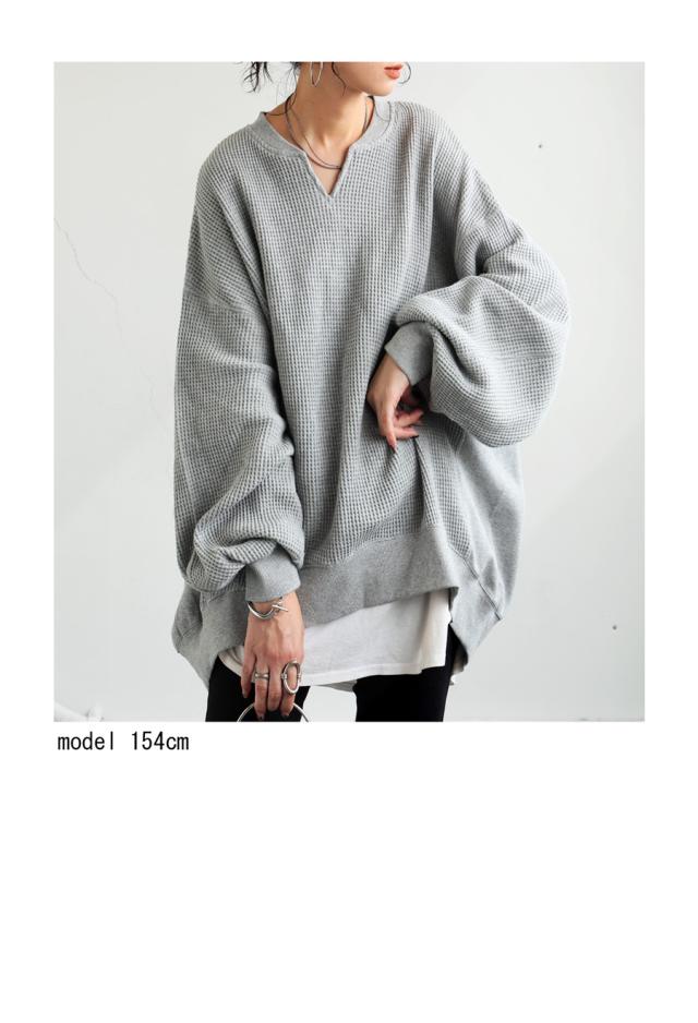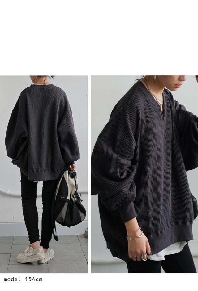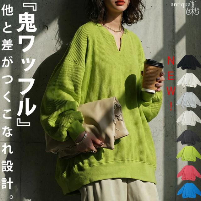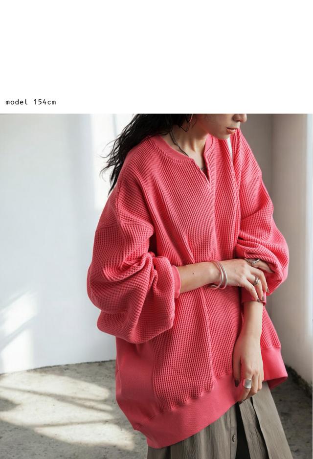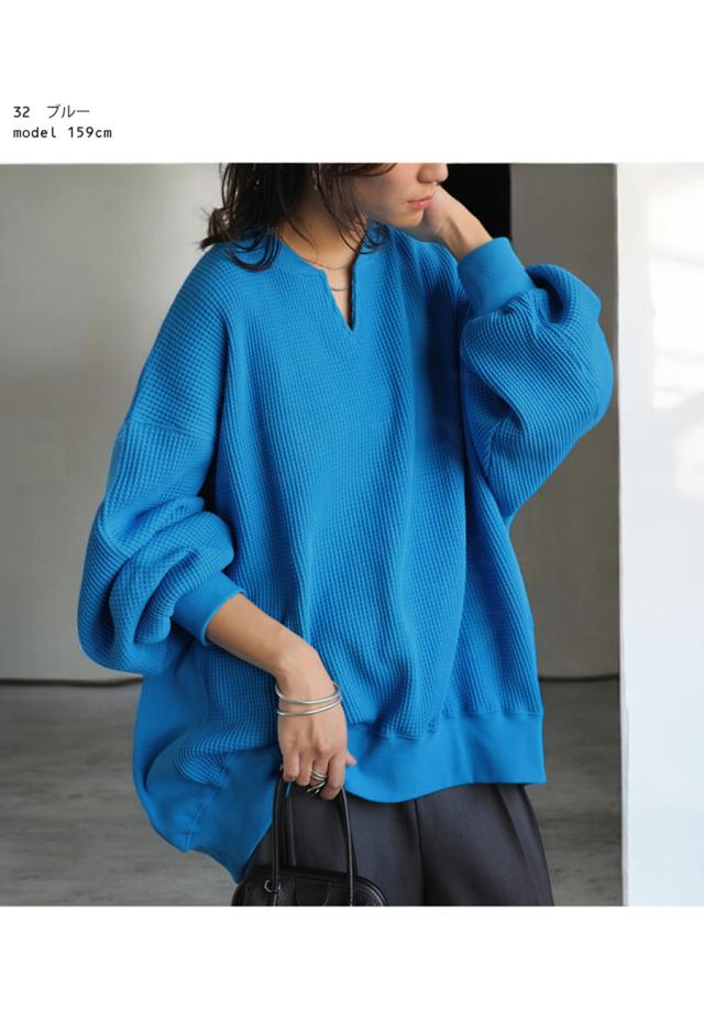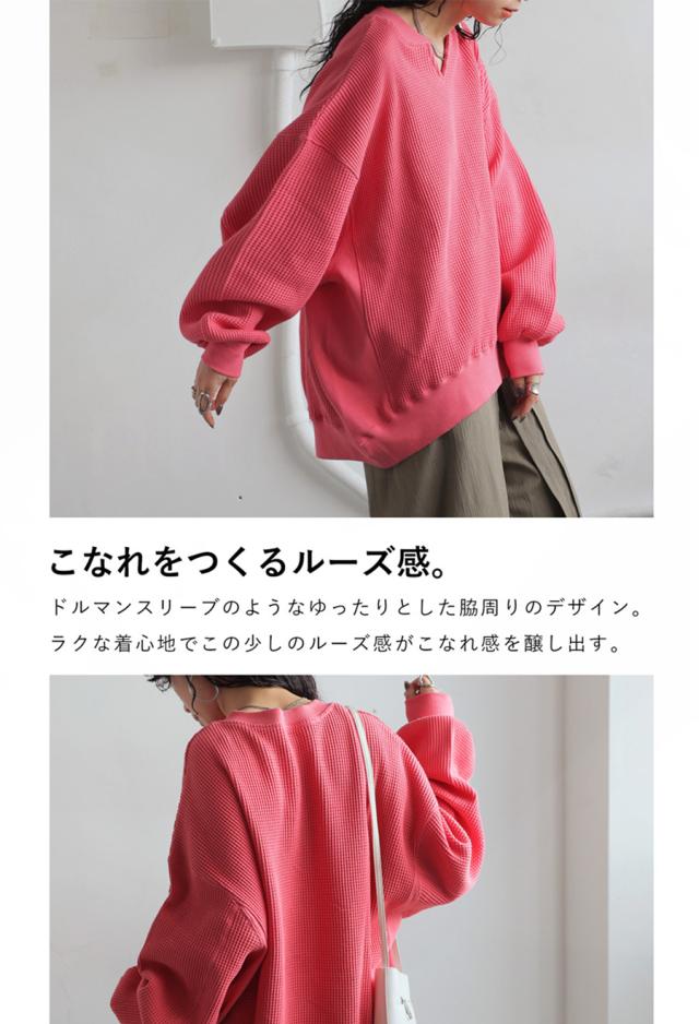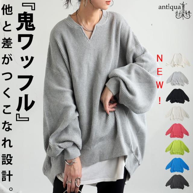 na-00482 プルオーバー トレーナー 長袖 無地 綿 コットン 鬼ワッフル シンプル クルーネック 切り替え ゆったり 前後差 ゆったり オーバーサイズ 着痩せ 体型カバー 大きめ 重ね着
