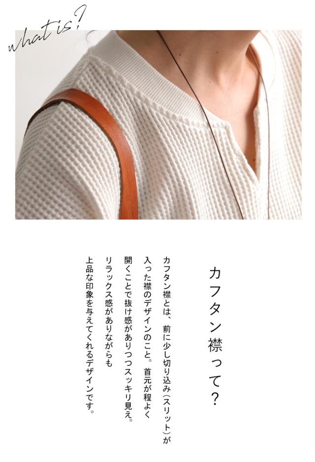 首元に少し切り込みを入れたカフタン襟が、鎖骨を美しく見せながらも、抜け感を演出します。