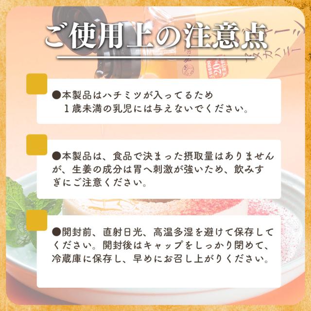 | 使用方法 | ●1回あたり大さじ1杯程度(約20g)をお好みに合わせて4〜6倍にお湯や水、炭酸水などで割ってお召し上がりください。お料理の調味料としてもご活用できます。 ※蜂蜜を含む製品のため、一歳未満の乳児には与えないでください。 ※沈殿、固化、分離が生じた場合はよく振ってからお召し上がりください。 ※天然の生姜と蜂蜜を使用しているため、生姜と蜂蜜の分離や、色調が異なる場合がございます。また、製造時の気泡が残存する場合がございますが、品質に問題ございません。 ※開封後は冷蔵庫で保存し、なるべくお早めにお召し上がりください。 |