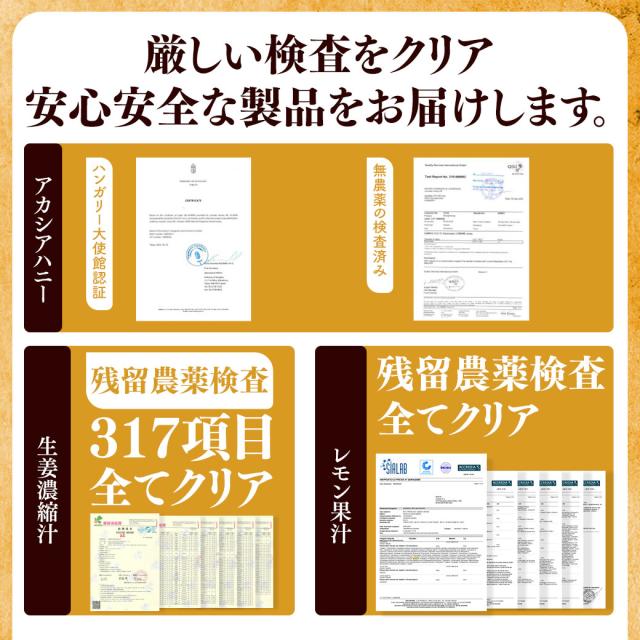 | 原材料名 | アカシアハニー(ハンガリー、中国、ドイツ産) レモン濃縮果汁 生姜濃縮汁 |