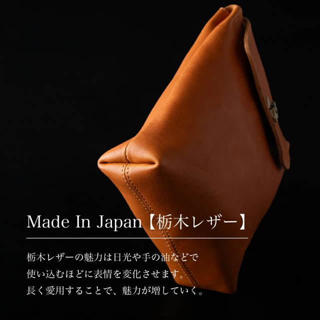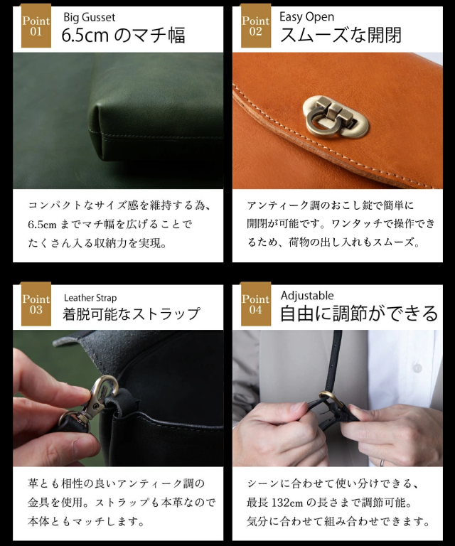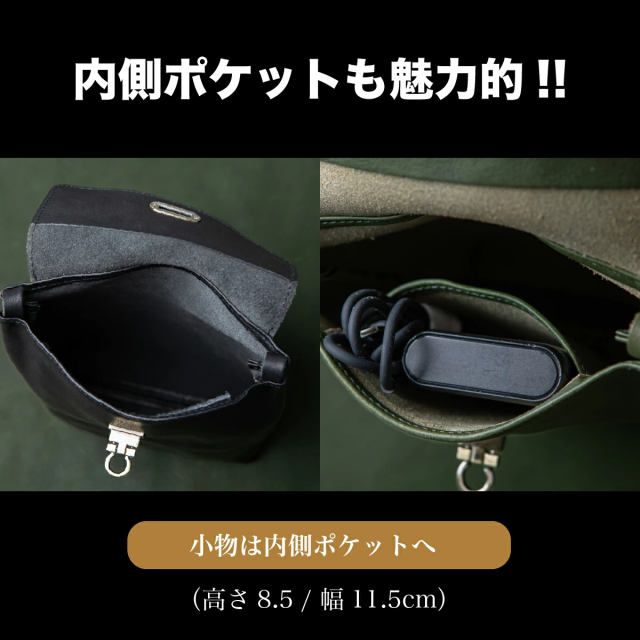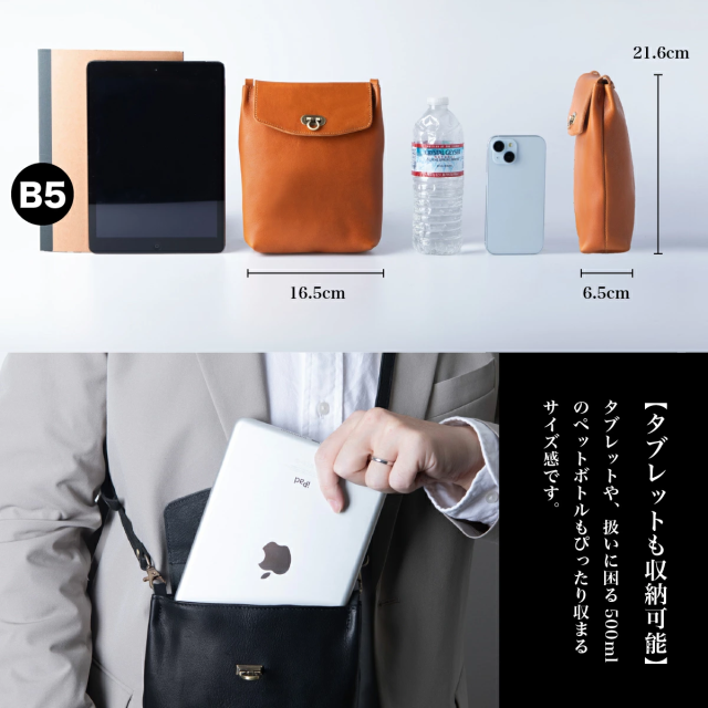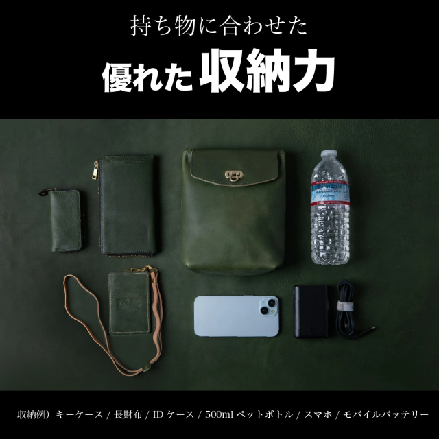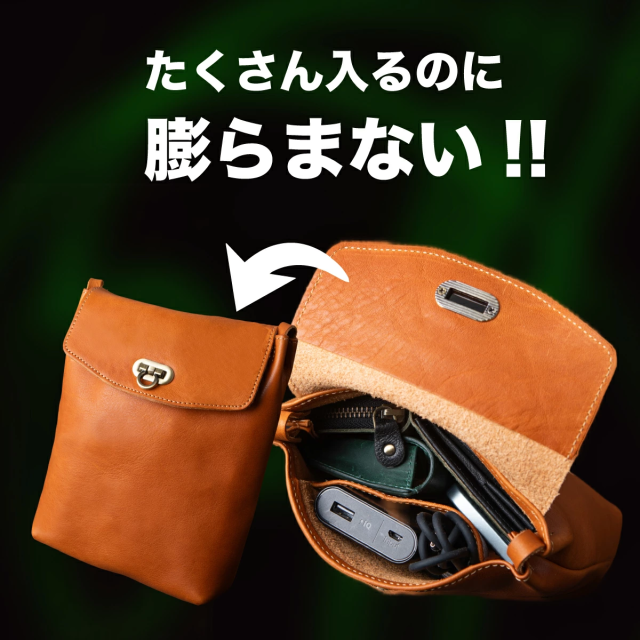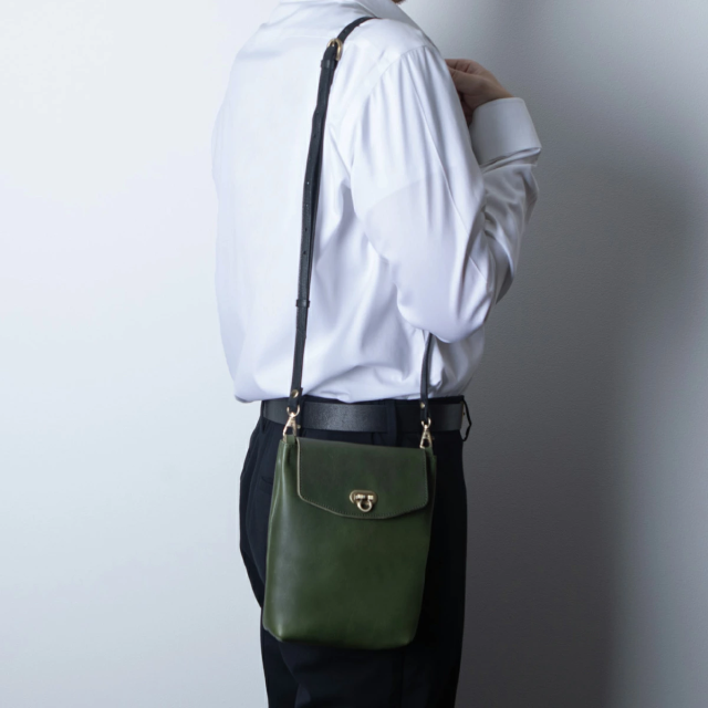 こちらは、タブレットや500mlペットボトルも余裕で収納できるミニショルダーバッグです。最高級の栃木レザーを贅沢に使用し、シンプルながらも高級感あふれるデザインが特徴。アンティーク調のおこし錠を採用しており、ワンタッチで簡単に開閉できるため、荷物の出し入れがスムーズに行えます。忙しい日常でもストレスなく使える実用性が魅力です。
