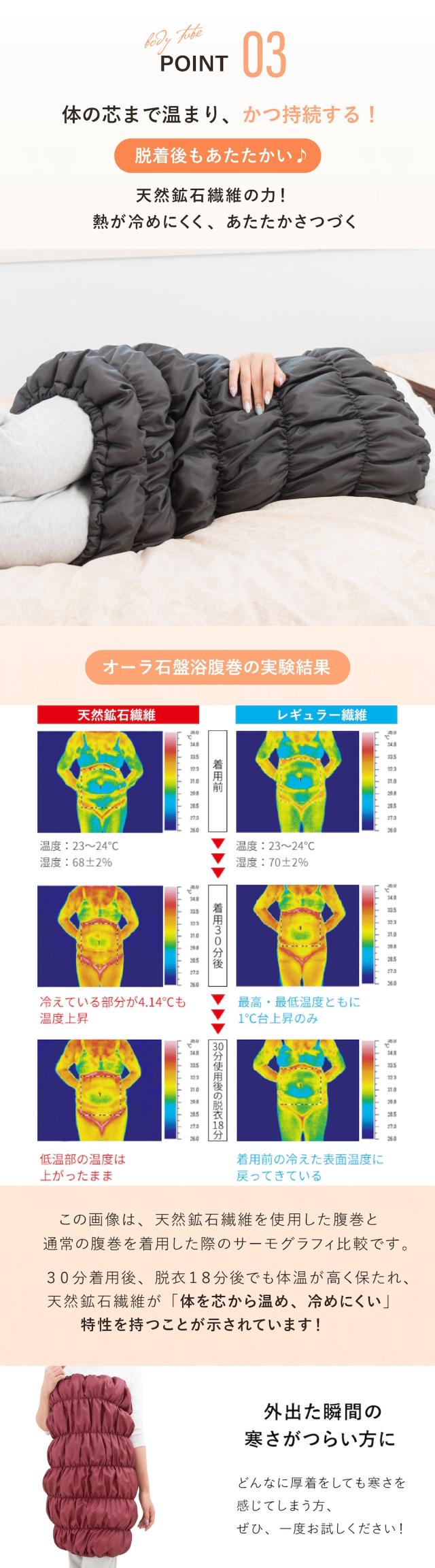 天然鉱石オーラストーンを練り込んだ繊維で出来ているボディチューブ。5分で11度の差が出る「遠赤外線」の暖かさ。着るだけで岩盤浴効果があります!
