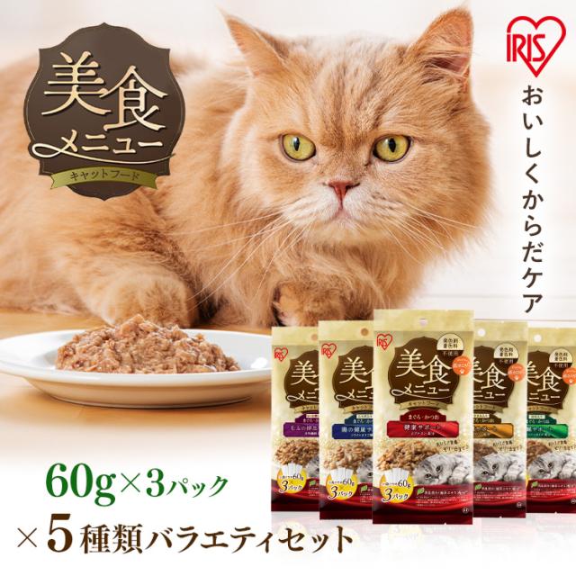 \5種お試し/ キャットフード ウェット 猫餌 パウチ 猫 ご飯 腎臓 心臓 毛玉 腸 サポート 健康サポート まぐろ ささみ 介護食 美食メニュー アイリスオーヤマ P-60 *