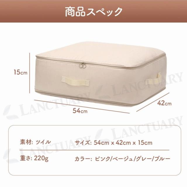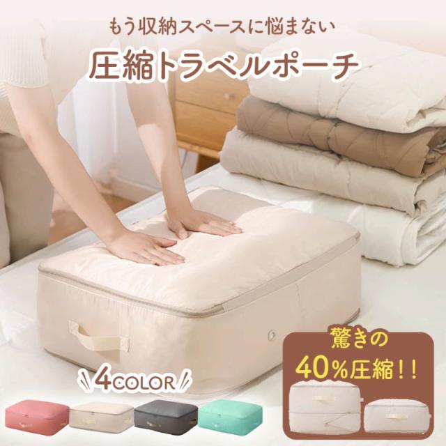 | 主な仕様 | 商品名: 圧縮トラベルポーチ カラー: ピンク、ベージュ、グレー、ブルー サイズ: 54×42×15cm 重さ: 約220g 素材: ツイル |
