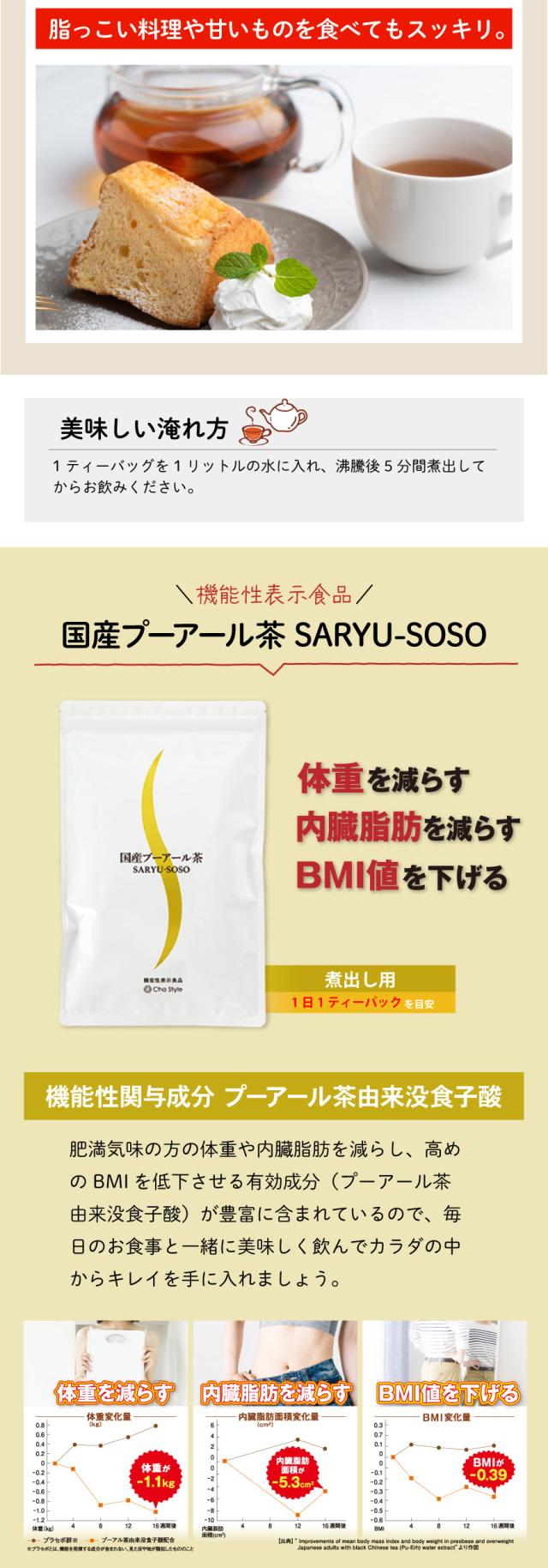 【内容量】国産プーアール茶 SARYU-SOSO(5g×10包)×1袋 低カフェイン国産プーアール茶(5g×10包)×1袋