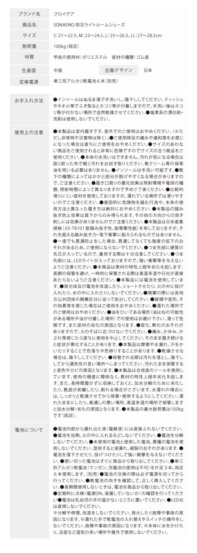 SONAENO 防災 ライトルームシューズ PROIDEA プロイデア 災害 地震 防災グッズ 防災アイテム ルームシューズ LEDライト 避難用シューズ 保護靴 高荷智也