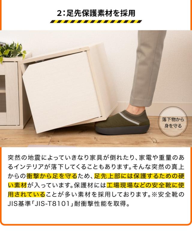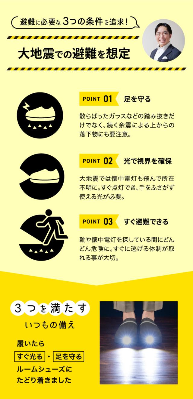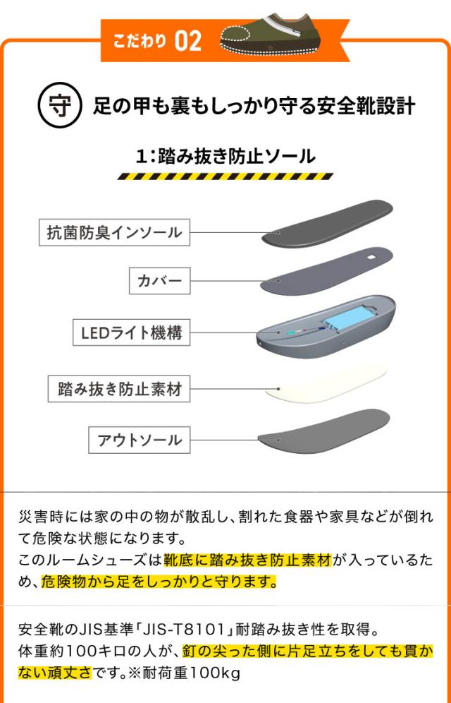 光るルームシューズ!夜間時の移動などにも役に立ち、災害時にも安心の発光力。つま先の補強と靴底のふみ抜き防止素材で室内用の安全靴としても抜群の機能性。 防災アドバイザー高荷智也さん徹底監修!プロの目線から理想的な災害の備えを実現。