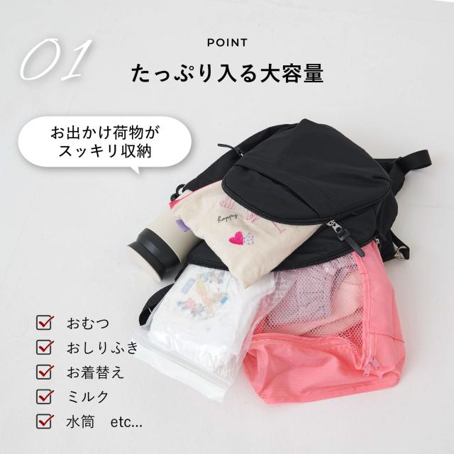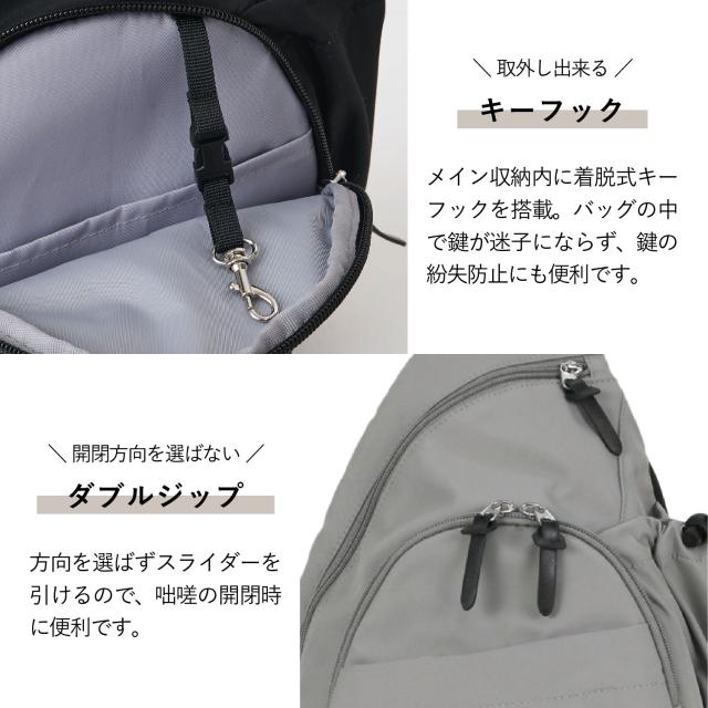 外側:ダブルファスナーポケット×1 キーフック付きオープンポケット×1 マグネットポケット×1 ボトルポケット×1 ファスナーポケット×1