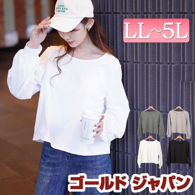 秋新作 大きいサイズ レディース トップス カットソー プルオーバー ボリュームスリーブクロップドプルオーバー 長袖 クロップド丈 ボリュームスリーブ ストレッチ ゆったり 冬服 春服 秋服 LL 2L 3L 4L 5L ブラック 黒 オフホワイト 白 グレー チャコール ゴールドジャパン