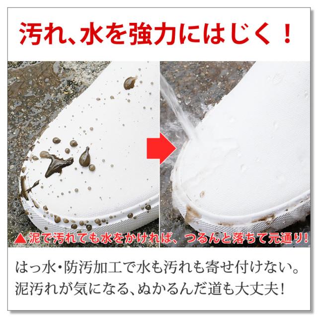撥水・防汚加工を施していて、静止4cm4時間防水だから雨も泥も寄せ付けず