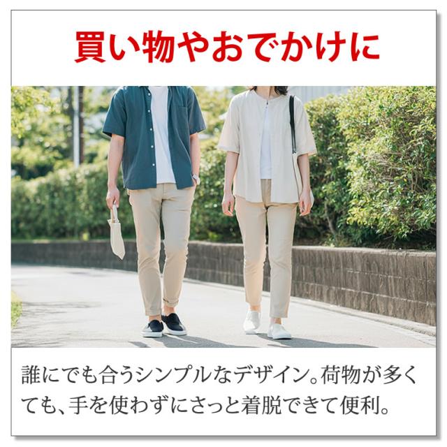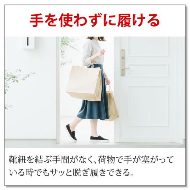 靴紐がないので手を使わずスムーズに脱ぎ履きができて、靴紐を結ぶ手間もいらないのが