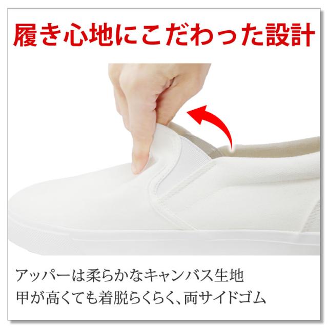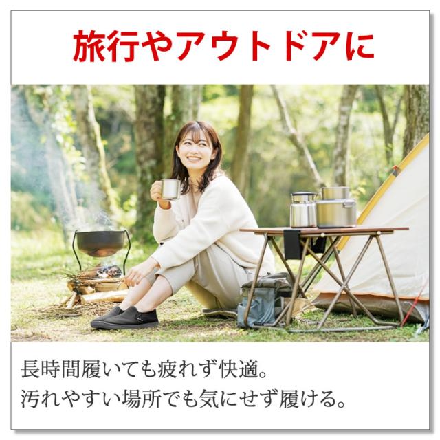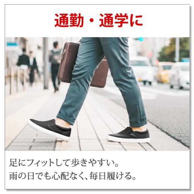 | アウトドアブランドのラドウェザー から、はっ水・防汚のスリッポンが誕生。 靴紐がないので手を使わずスムーズに脱ぎ履きができて、靴紐を結ぶ手間もいらないのが スリッポンの最大の魅力。 荷物を抱えていたり、子供を抱っこして手がふさがっている時でも脱ぎ履きラクラク。 撥水・防汚加工を施していて、静止4cm4時間防水だから雨も泥も寄せ付けず 雨の日でも、公園やキャンプなど汚れやすい場所でも気にせず履ける。 防水・防汚加工にはドイツのルドルフ社が誇る環境にも優しく高性能な最先端の加工「BIONIC FINISH」を使用している。 アッパーは柔らかなキャンバス生地、両サイドはゴムになっているから足の甲が高い人でも着脱しやすい。 ソールは柔らかくクッション性も高いので、たくさん歩いても足が痛くなりにくい。 アウトソールはグリップ力が高くて滑りにくく、耐久性も高いゴム底なので 舗装されていない公園やアウトドアにも安心して使える。 シンプルでどんなファッションにも合う使いやすいデザインだから、年代・性別・服装・シーンを問わず誰でも履ける。 通勤・通学、毎日の買い物、休みの日のおでかけ、アウトドア、急な入院や災害時、厨房でも大活躍。 いつでも履ける優れモノ。 ■汚れ、水を強力にはじく! はっ水・防汚加工で水も汚れも寄せ付けない。泥汚れが気になる、ぬかるんだ道も大丈夫! ■最先端のはっ水・防汚加工 使用しているのは環境先進国のドイツが生んだ人にも自然環境にも優しい加工。 ■防水だから雨の日もOK! 普通のスニーカーに見えて、すごい防水性能。「静止4cm / 4時間」なので、雨の日も大丈夫。 ※完全防水ではありません。 ■手を使わずに履ける 靴紐を結ぶ手間がなく、荷物で手が塞がっている時でもサッと脱ぎ履きできる。 ■履き心地にこだわった設計 アッパーは柔らかなキャンバス生地。甲が高くても着脱らくらく、両サイドゴム ■滑りにくくて丈夫なソール グリップ力が強くて滑りにくいラバー素材でアウトドアや雨の日のコンビニでも大活躍。 ■歩きやすい 柔らかく足にフィットするソールはしなやかで返りが良く、履き始めから歩きやすい。 ■どんなファッションにも合う シンプルなデザインでどんな服とも相性抜群。性別、年齢も問わない。 ■通勤・通学に 足にフィットして歩きやすい。雨の日でも心配なく、毎日履ける。 ■買い物やおでかけに 誰にでも合うシンプルなデザイン。荷物が多くても、手を使わずにさっと着脱できて便利。 ■旅行やアウトドアに 長時間履いても疲れず快適。汚れやすい場所でも気にせず履ける。 ■急な入院や災害に備えて 室内履きにもおすすめ。スリッパのように脱げたりしないので、安全に歩くことができる。 ■飲食店で働く人に 滑りにくいソール、水や油汚れを弾く機能はコックシューズとしても活躍。 | |