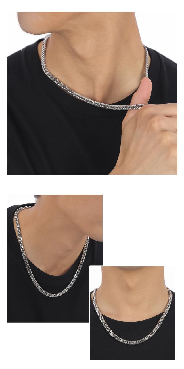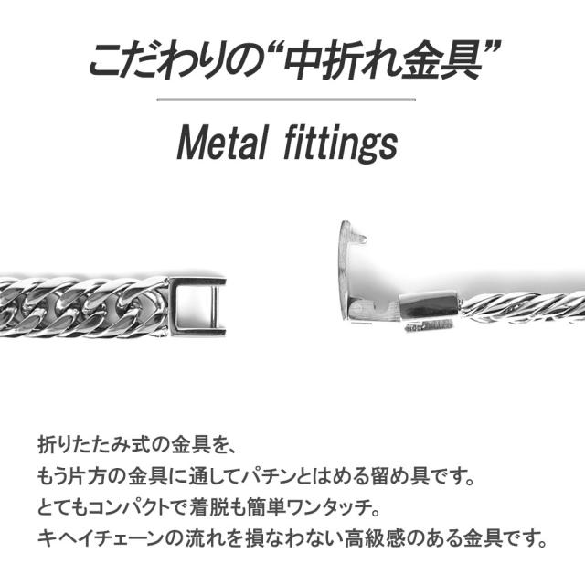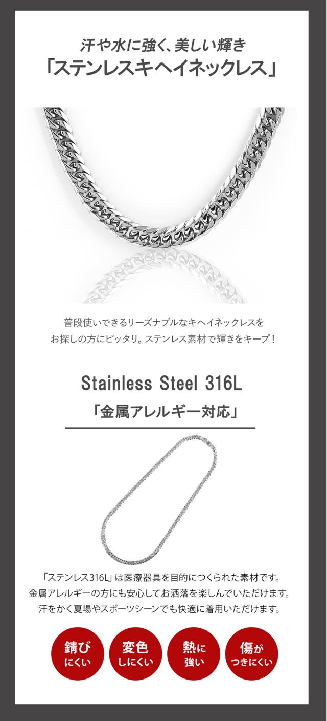 同型の「 プラチナ」「 6面ダブル 」キヘイチェーンサイズの場合、想定 "85g"となりますが、ステンレスキヘイは"34g"と軽量に着用できます。ステンレス素材のキヘイはお手入れ簡単で普段使いに最適な素材となっております。