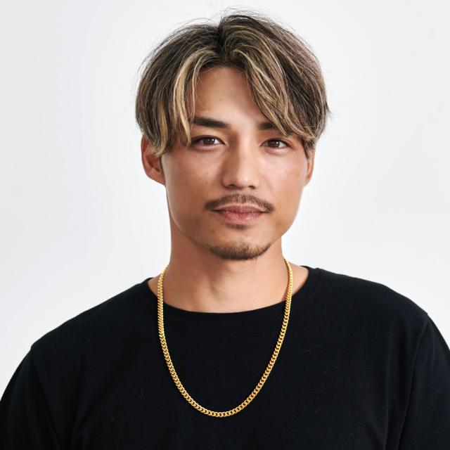 重量感と存在感がある喜平チェーンネックレスはコーデのアクセントにぴったり。