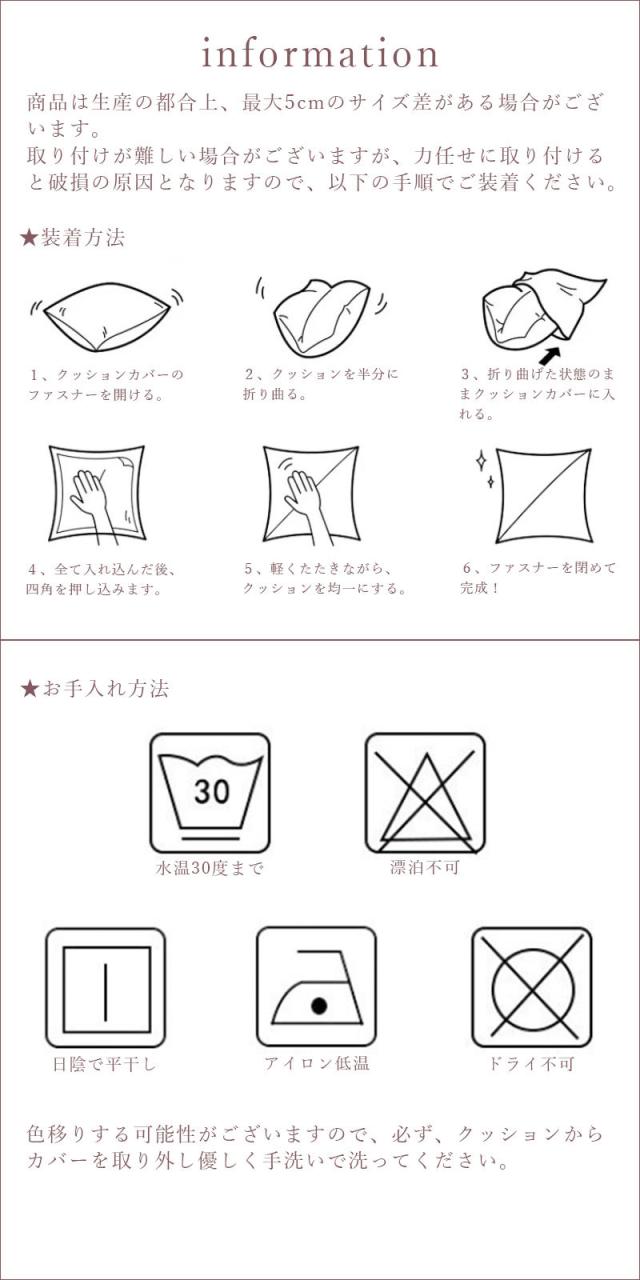 | 注意 事項 | ※カバーのみの販売となり、クッション本体の付属はありません。 ※生産ロッドの違いにより細部のデザインが多少異なる場合がございます。予めご了承くださいませ。 ※画像はイメージです。実物と多少異なる場合がございます。予めご了承くださいませ。 ※製品の特性上、糸のほつれやキズ、汚れなどが発生する場合がございます。使用に支障がない程度は許容範囲とさせていただきます。ご了承の上、ご購入くださいませ。 ※ご使用のモニター環境によって多少色合いが異なる場合がございます。 |
