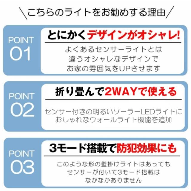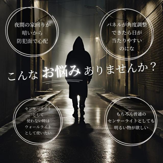 このソーラーセンサーライトは、優れた機能性と高いデザイン性を兼ね備えています。省エネでありながら、夜間や暗い場所での安全性を確保する強力な味方として、暮らしをより豊かにする一品です。ぜひ、日常生活やアウトドアにお役立てください。
