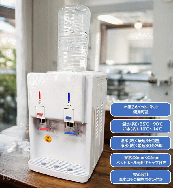 ペットボトルが使える!冷水もお湯もすぐ飲める温冷水サーバー。温冷なのでオールシーズンご使用できます。市販の2Lペットボトルも差し込むだけで使用可能。温めたり冷やしたりする手間が省けていつでも必要な時にすぐ使えます。直径28mm、32mmのペットボトル専用キャップ付き。温水ロック解除ボタン付きの安心設計。■本体サイズ約23×25×38.5cm■本体重量約2.2kg■電源100V 50/60Hz■消費電力[温水]345W[冷水]57W■タンク容量[温水]約600ml[冷水]約600ml■コード長さ約1m■温度範囲[温水]約85〜90℃[冷水]約10〜14℃※水温約20℃、室温約25℃での保温/保冷温度目安。使用環境(室温、水温)により誤差が生じる場合がございます。■設置場所:屋内専用■材質:ABS、PP、他■付属品:本体、ボトルトレー、水受けトレー、ペットボトル専用キャップ(直径28mm)×1、ペットボトル専用キャップ(直径32mm)×1、取扱説明書■生産国:中国製※本製品は一般家庭用です。業務用としては絶対にご使用にならないで下さい。再生プラスチック等を利用した薄い素材のペットボトル飲料水は絶対にご使用しないで下さい。