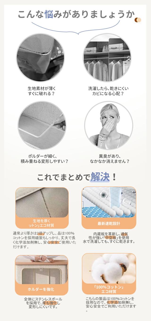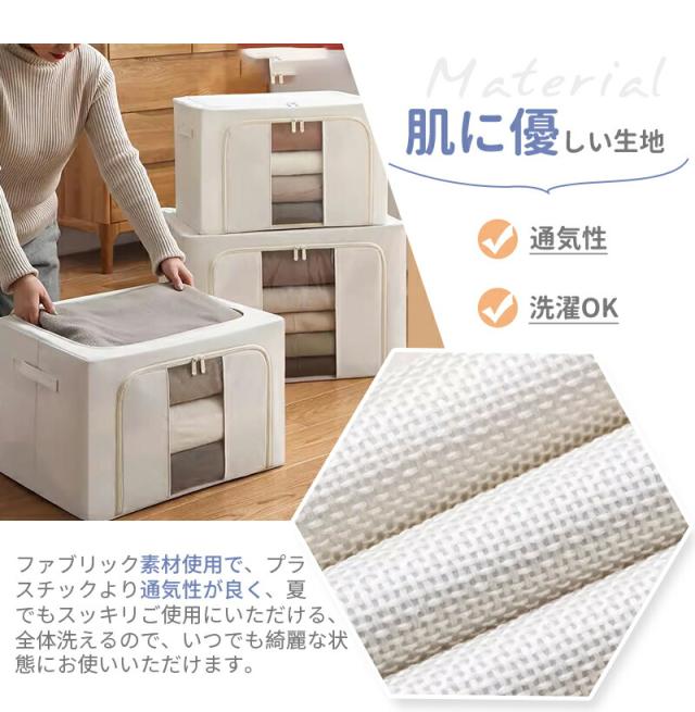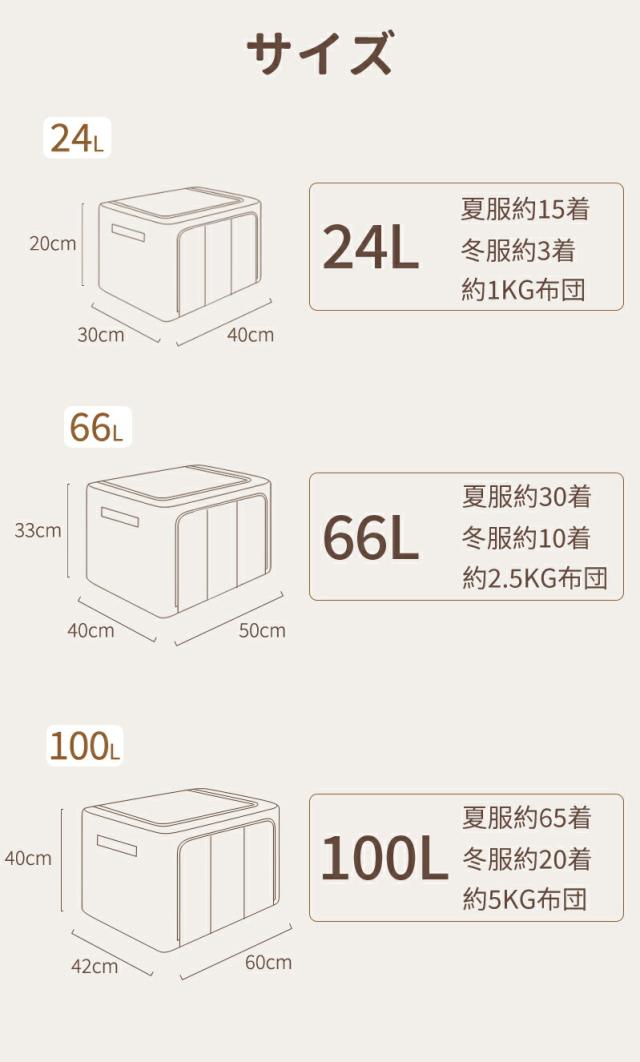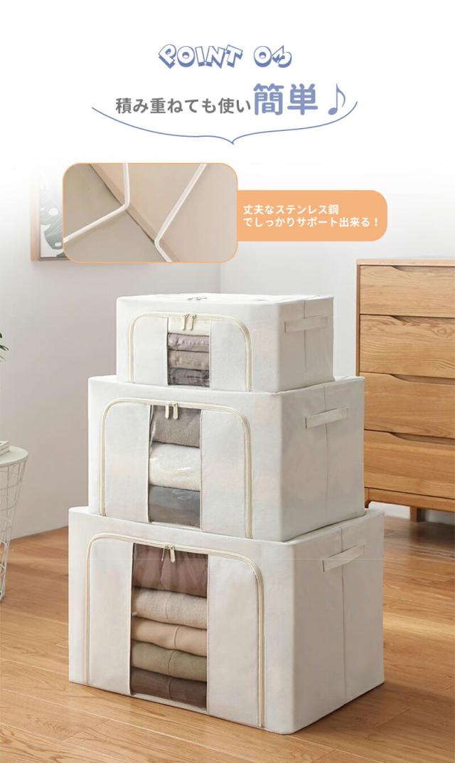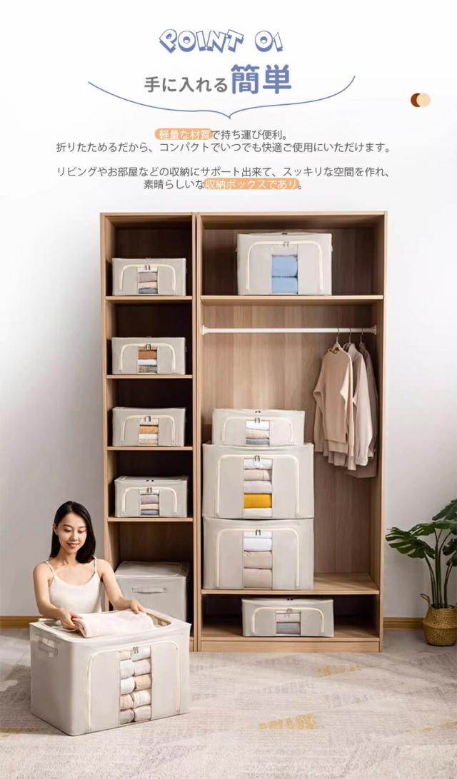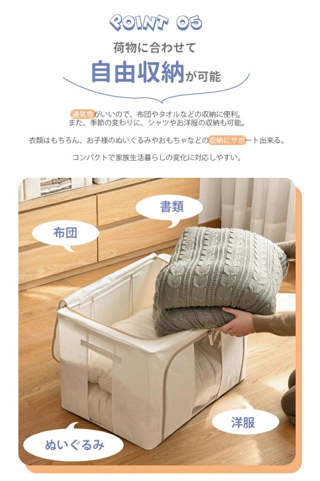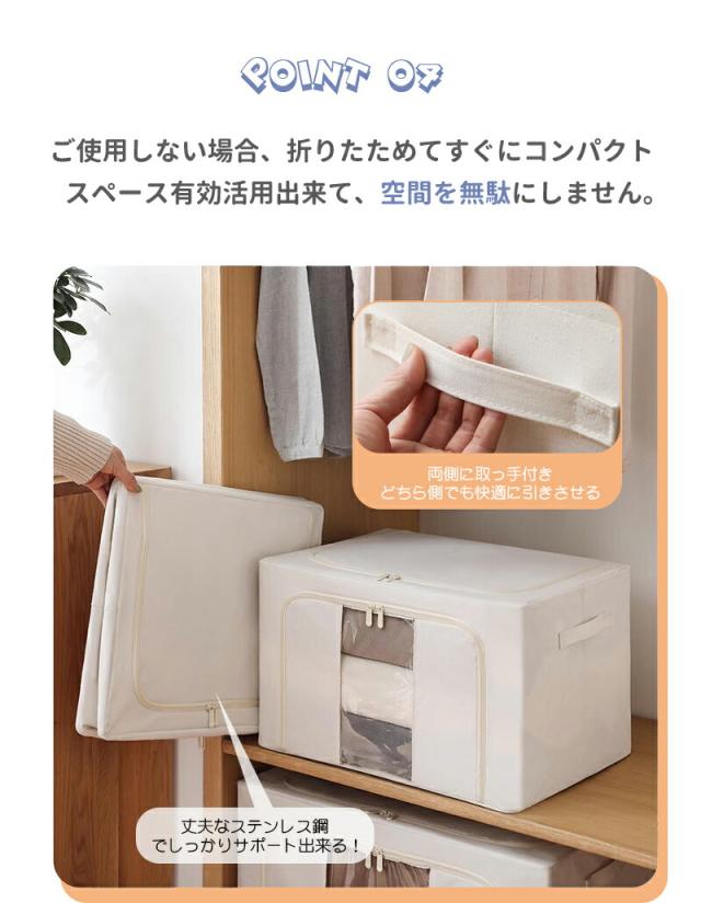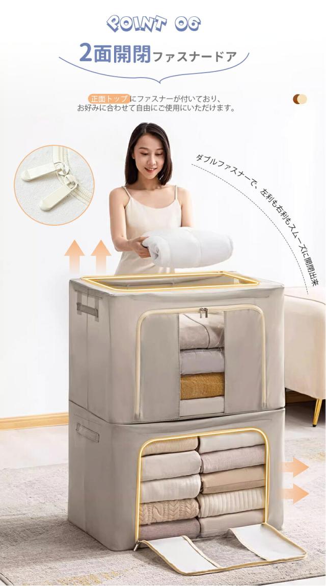 - とても大容量で衣類や布団をすっきり収納できます。前開きタイプなので出し入れがしやすく、毎日の整理整頓が楽になりました。折りたためるので使わない時も省スペースで便利です。