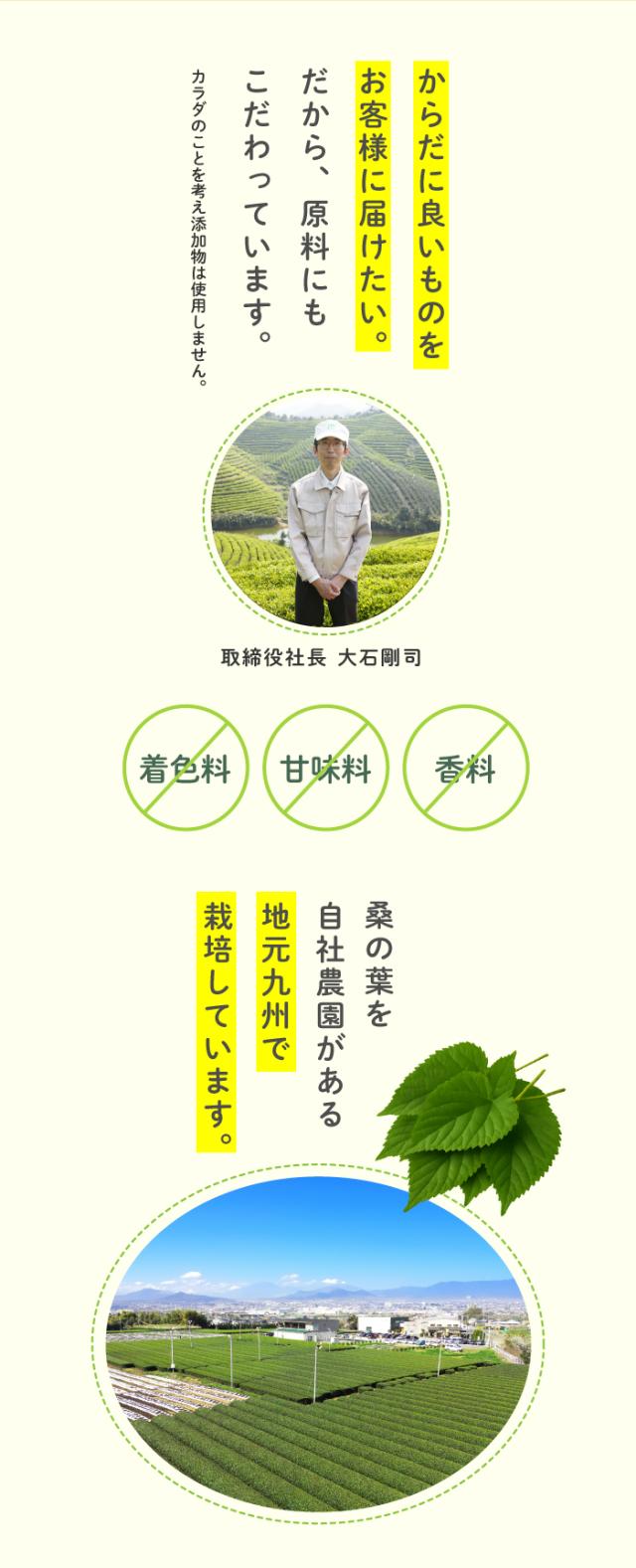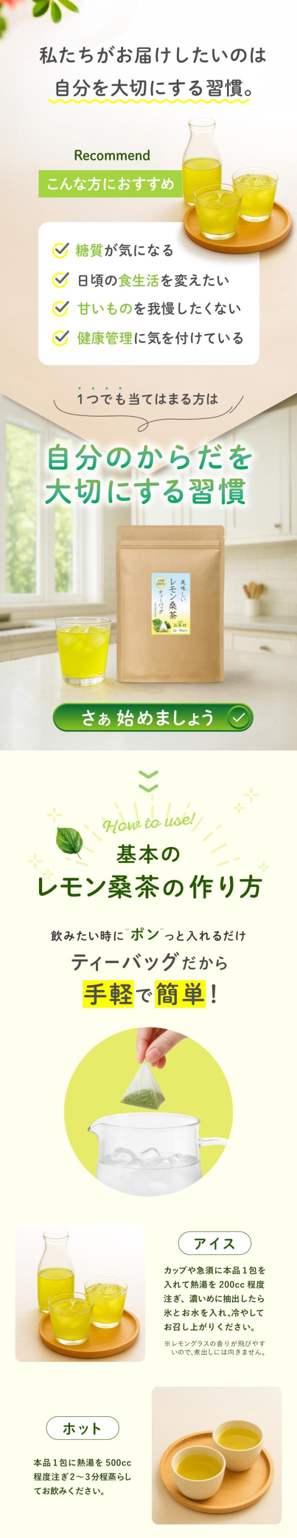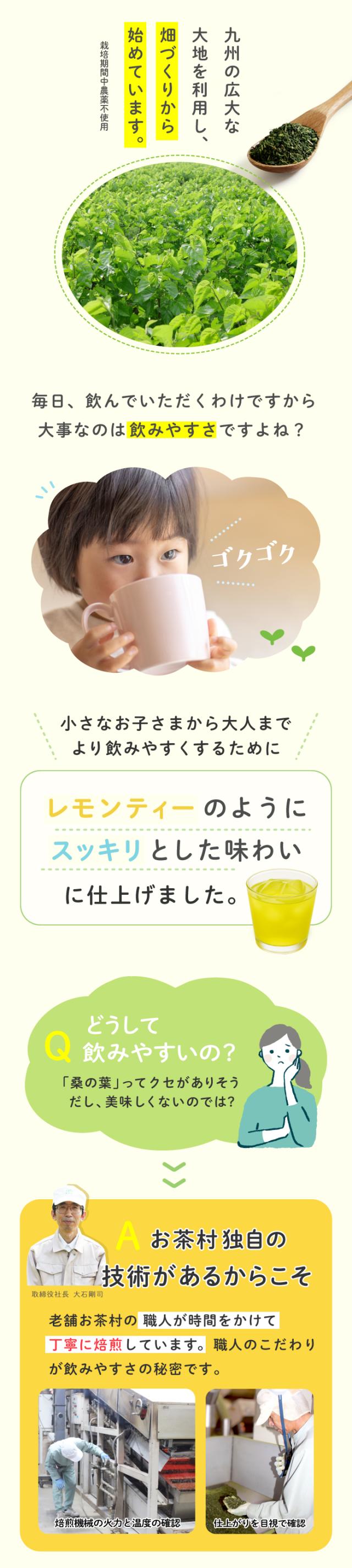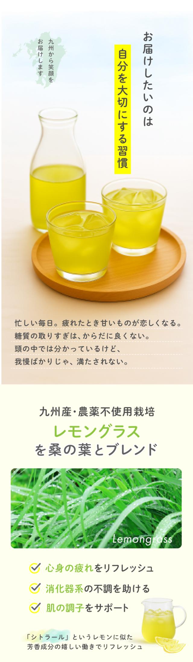 - 大きめのマグカップにお湯を注いで、ティーバッグを乗せて3分。レモンの爽やかな香りで桑茶のクセが感じられず飲みやすいです。夏場の冷えた社内で飲むのに最適です。