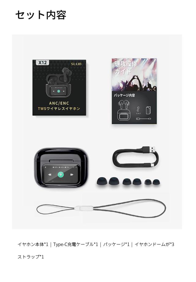 イヤホン本体、充電ケース、Type-C充電ケーブル、イヤーピースセット、ストラップ、取扱説明書。