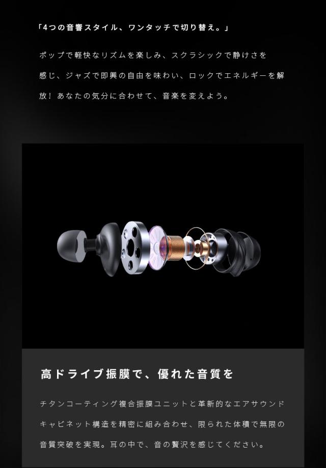 内蔵されたマイクに環境ノイズキャンセリング(ENC)技術を採用し、通話時の外部ノイズを低減可能。ユーザー側の風の音や交通の音など、周囲の雑音をしっかりとカットし、クリアな音声を通話相手に届けるので、大切な電話や会話をよりスムーズに行えます。 【音質を自分好みにカスタマイズ】