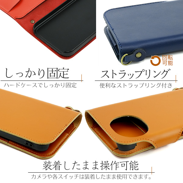 美しい質感と滑らかな触り心地の牛革を使用しています。 一つ一つ丁寧に制作しています。 実用新案登録済のカード落下防止フラップ付き! 逆さにしてもカード落下の心配がありません。 大切なカード収納時やネックストラップ使用時などに最適です。 内部ケースはハードケースなのでしっかりとスマートフォンを固定できます。 横開きタイプなので、手帳のように使うことができます。 また、内側にはカードポケット2つとフロント/サイドポケットが付いています。 しっかりと固定できるマグネット式スナップボタンを採用しています。 便利なストラップリング付きで、ストラップなどを装着可能です。 | ||||||||||||||