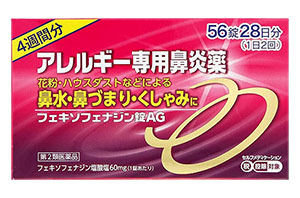 フェキソフェナジン錠AGは第2世代抗ヒスタミン薬に分類されるフェキソフェナジン塩酸塩を含有するアレルギー専用鼻炎薬で、花粉、ハウスダストなどによる鼻のアレルギー症状(くしゃみ・鼻みず・鼻づまり)の改善にすぐれた効果を発揮します。
