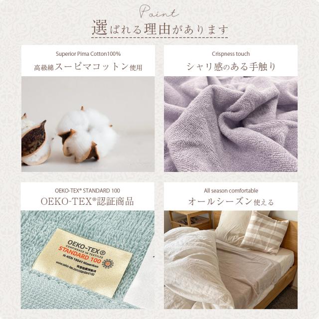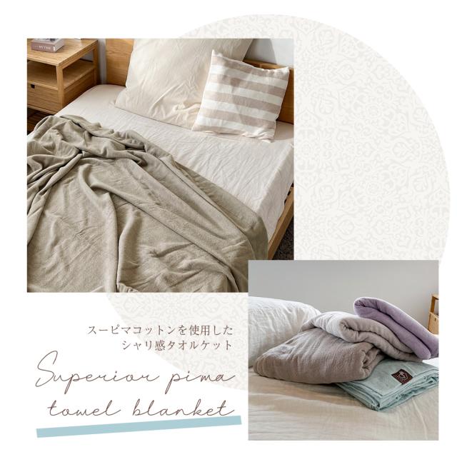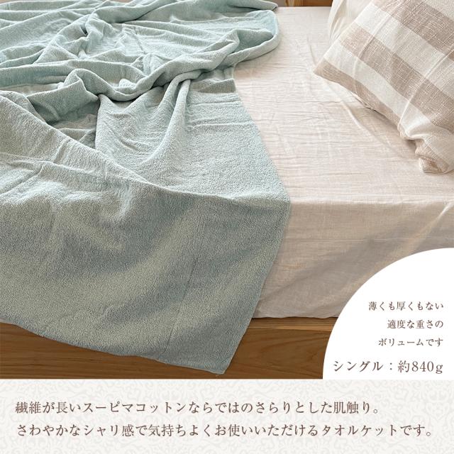 吸水性に優れ、やわらかで軽やかな気持ちよさが続くタオルケット。やわらかで軽やかな風合いが長く続き、しなやかで毛羽落ちが少ないスーピマコットンを100%使用。気軽に使える心地よさと汗をかいてもサラっとベタつきにくい使用感。薄くも厚くもない適度なボリューム、色違いの2本の糸を撚り合わせ、落ち着いた杢調に仕上げたシンプルで落ち着きのあるタオルケットです。軽くて重苦しくなく、お肌のデリケートな方もお子様も安心。春夏だけでなく、寒い季節も掛け布団と合わせて使うことで、ムレない毛布としてオールシーズンお使いいただけます。