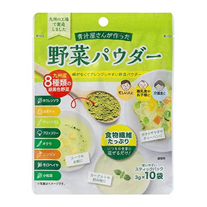 九州産の8種類の緑黄色野菜のパウダーと難消化性デキストリン(とうもろこしなどのデンプンからつくられた食物繊維)をブレンドしましたので、毎日の料理やスープに混ぜてお召し上がりください。