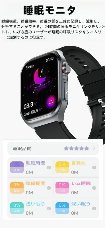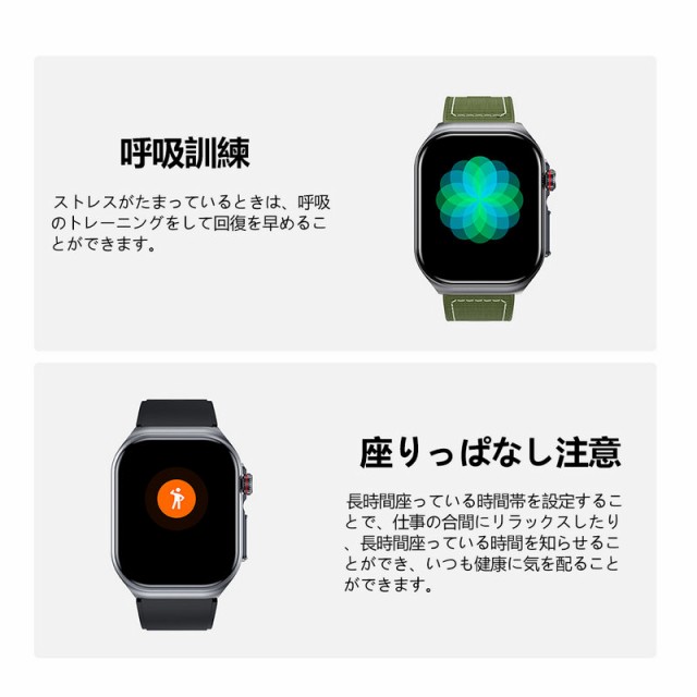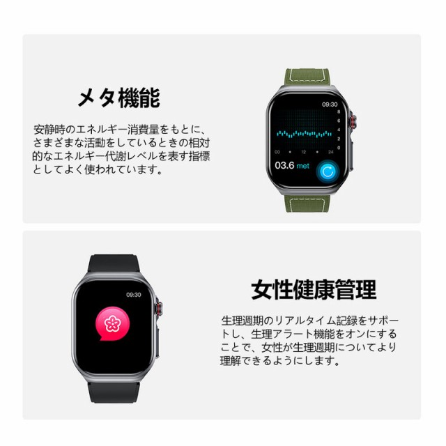 ・健康管理:SOS機能、体組成検査、心電図、体温監視、血圧測定、血中酸素、心拍計、活動量計、歩数計、音楽制御、座りがちの自動注意、睡眠モニター、運動モニター、スポーツ、カメラ操作、カロリー、睡眠の質と時間及び日常生活のさまざまなシーンで測定ができます。