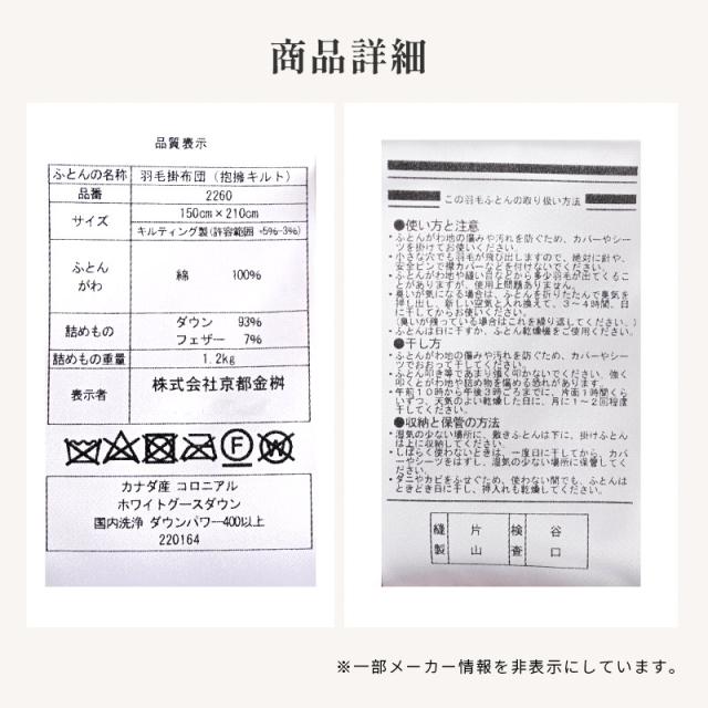 【半額】羽毛布団 シングル グース ダウン93% 150×210 京都職人の羽毛布団 増量1.2kg 400dp以上 日本製 京都羽毛 梅 二層式 超長綿 特殊キルト
