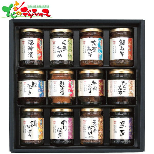 | 商品内容 | ■福神漬90g・くきわかめ75g・大葉みそ100g・鯛みそ100g・鰹ひじき40g・鮭茶漬60g・牛肉ごぼう55g・たらこ昆布50g・鶏そぼろ50g・のり佃煮95g・えのきだけ90g・黒豆100g ※パッケージ・仕様・成分などは予告なく変更になる場合がございます。なお、旧商品在庫がなくなり次第、リニューアル品(新商品)での発送となる場合もあります。その場合はどうぞご了承下さいませ。 |