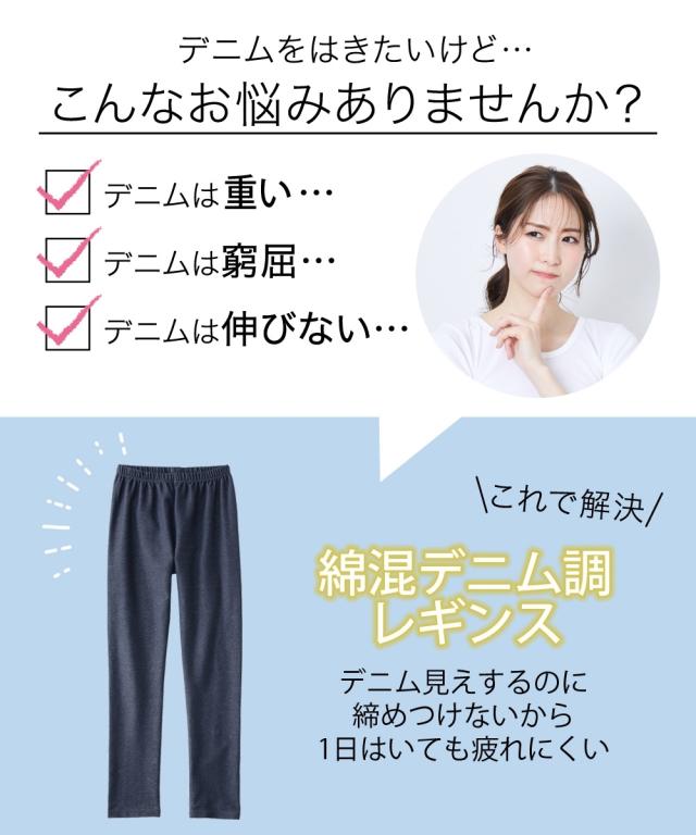綿混デニム調10分丈レギンス デニムをはきたいけど… \こんなお悩みありませんか/ ・デニムは重い… ・デニムは窮屈… ・デニムは伸びない…これで解決!!綿混デニム調レギンス』デニム見えするのに締め付けないから1日中はいても疲れにくい ◇POINT◇ 【デニム見えでもやわらかい】 綿混素材で肌たりがソフト、はき心地らくちん 【デニム見えでものびーる】 動きやすいタテヨコストレッチ素材ではき心地らくちん 【デニム見えでもウエストゴム】 ウエストはぐるり1周ゴムでらくちん ゴムがねじれにくい縫製ではきごこち快適 ◆10分丈レギンス◆ 何枚あっても便利 年中活躍する定番のくるぶし丈 〇はきこみ丈深めでかがんでも背中が見えにくい 〇締めつけないフィット感 〇足首までカバーする10分丈デニム調のレギンスはコーデがこなれる”足戦力” ソフトストレッチが入っていて履き心地抜群です