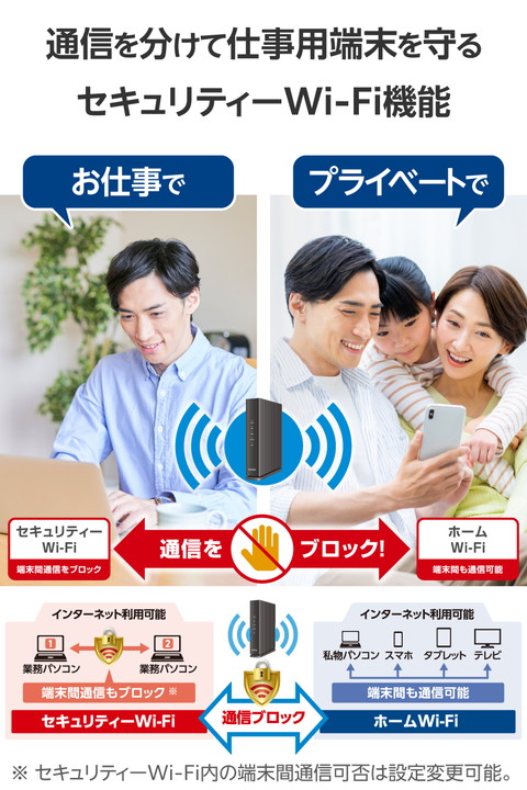 Wi-Fi 6対応で複数台同時接続時しても、より安定した高速通信を実現。手軽にかんたん快適Wi-Fi体験で、スマホなどでの動画視聴時もスムーズな通信が可能に!IPv6(IPoE)対応 Wi-Fi ギガビットルーター。![]() ■Wi-Fi 6対応でより安定した高速通信に対応しています。 ■複数台接続に強いOFDMA、送信情報量をアップする1024QAM、複数台同時接続が可能なMU-MIMO(※)、スマホのバッテリーが長持ちするTWTなど、多くのデバイスをつないでもストレスなくスムーズな通信を実現します。 ※Downリンクのみ対応 ■回線が混雑しにくいIPv6 IPoEインターネット接続に対応し、快適な通信が可能です。 ■IPv6 IPoEインターネット接続であれば、インターネットポートにLANケーブルを接続するだけですぐにインターネットが使えます。 ■Wi-Fi EasyMesh(TM)(ファームウェア Ver.2.0.3以上)。電波の届きにくい場所でも、対応機器と連携することで、家中のWi-Fi通信エリアを効果的に拡大することができます。 ■高速なローミングのため、お部屋を移動して接続先が切り替わっても、再接続がスムーズなため快適な通信を維持することができます。 ■※1台のルーターに6台以下の中継器の接続を推奨します。7台以上接続の場合、環境により通信が不安定となる場合があります。 ■4Kテレビ対応。電波干渉に強い5GHz帯は最大1,201Mbps(理論値)、一般的な通信帯域である2.4GHz帯は最大574Mbps(理論値)の高速通信でテレビでのネット動画視聴やインターネット視聴も快適です。 ■セキュリティWi-Fi(通信分断機能)搭載で他の端末からウイルス感染されたり、情報を盗み見られたりする危険性を軽減しながらインターネットができます。 ■買い換えの場合、「らくらく引っ越し機能」を使用することで、面倒な設定無くテレビやスマホ、タブレット、パソコンなどが使えます。 ■使用中のルーターと本機のWPSボタンを押すだけで、自動的に使用中のルーターの情報(SSID・暗号化キー)をコピーできます。 ■内蔵アンテナで、すっきりした見た目ながら快適な通信を実現します。 ■「バンドステアリング機能」を搭載し、より快適な帯域(5GHz/2.4GHz帯)を自動で選択・接続します。 ■集中して電波を送信する「ビームフォーミングZ」により、iPhoneやAndroidなどの対応する端末では、離れた場所でも快適につながります。 ■「友だちWi-Fi」※(ゲストSSID)機能を搭載することで、自分のプライバシーをしっかり守りながら、安全にWi-Fiを提供することができます。※2.4GHz帯のみ使用可能 ■お子様を守るため、ネットの使いすぎを防止する「こどもネットタイマー3」を搭載しています。 ■より強固なセキュリティ規格「WPA3 Personal」に対応しています。 ■自動で最新のファームウェアにアップデートするので、新機能の追加やバグ修正、脆弱性対策など、常に最新のプログラムでルーターをお使いいただけます。 ■ルーター/AP(アクセスポイント)/中継器の基本動作モードに加え、使用する5GHzの周波数帯をスイッチで切り替えることが可能な「通常」「離れ家モード」(※)を搭載。使用環境に合わせて柔軟にモードを変更することが可能です。 ■※「通常」は5GHz帯のW52/W53/W56が有効。「離れ家モード」は5GHz帯のW52/W53が無効/W56のみ有効です。W52/W53は気象レーダーや航空レーダーなどと干渉するため、屋外で使用することは法律で禁止されています。「離れ家モード2」対応製品ではルーター/AP(アクセスポイント)/中継器、すべての基本動作モードで、離れ家モードが使用可能です。 ■便利な「離れ家モード2」搭載。屋外を含む敷地内の母屋と離れた建物で中継器として使用可能なほか、「離れ家モード2」対応製品ではすべての基本動作モードに対応。親機として使用している場合も玄関先やベランダなど敷地内の屋外に設置されたデバイスと5GHz(W56のみ)でWi-Fiで接続することが可能です。 ■通常設置の縦置きに加え、障害物に邪魔されにくい壁掛けにも対応しています。※壁掛けの際も縦方向で設置してください。 ■本製品はDLPA(一般社団法人デジタルライフ推進協会/英語表記:Digital Life Promotion Association)が推奨する、ルーターをご家庭でより安全にお使いいただくための機能に対応した、DLPA推奨ルーターです。 ■自社環境認定基準を1つ以上満たし、『THINK ECOLOGY』マークを表示した製品です。 ■環境保全に取り組み、製品の包装容器が紙・ダンボール・ポリ袋のみで構成されている製品です。 ![]() ■対応OS(Windows):Windows 11/10 ■対応OS(macOS):macOS Sequoia 15/macOS Sonoma 14/macOS Ventura 13/macOS Monterey 12/macOS Big Sur 11 ■対応OS(iOS):iOS 18/17/16/15 ■対応OS(iPadOS):iPadOS 18/17/16/15 ■対応OS(Android):Android 16/15/14/13/12/11/10 ■対応OS 備考:※メーカーのサポートが終了したOSでは、基本機能以外の動作保証やサポートに対応できない場合があります。 ■セットアップツール対応ブラウザ:Microsoft Edge、 Google Chrome 、Safari ※標準搭載のWebブラウザーを使った初期設定(インターネット接続設定)のみ対応しています。 ■対応機器(無線LAN):iPhoneシリー