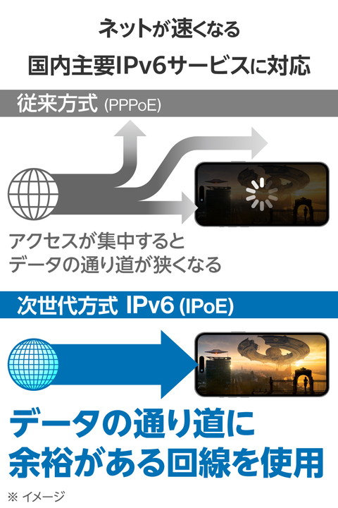 Wi-Fi 6対応で複数台同時接続時しても、より安定した高速通信を実現。手軽にかんたん快適Wi-Fi体験で、スマホなどでの動画視聴時もスムーズな通信が可能に!IPv6(IPoE)対応 Wi-Fi ギガビットルーター。