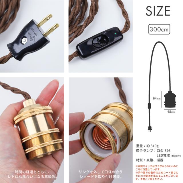 コンセントプラグ ペンダントライト E26 ブラスソケット 300cm ロングコード 真鍮 ソケット ブラス ゴールド 日本製 工事不要 賃貸 間接照明 スイッチ付き 吊り下げ 壁掛け レトロ おしゃれ 可愛い 北欧風 カフェ風 シンプル LED電球対応