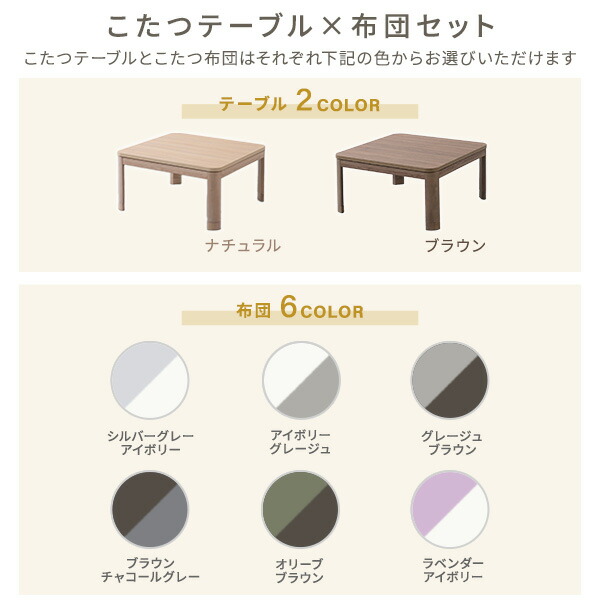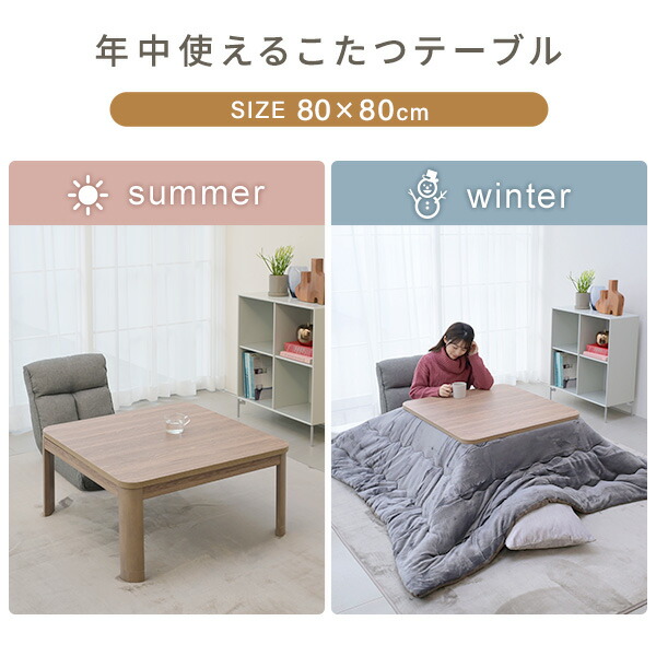 | 本体サイズ | 【こたつ本体】 幅80×奥行80×高さ36cm(継脚時高さ41cm) 重量17kg 【こたつ布団】 縦185×横185cm ポリエステル綿1.5kg |