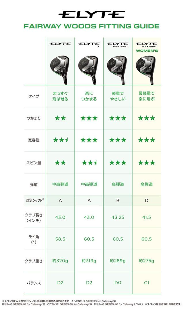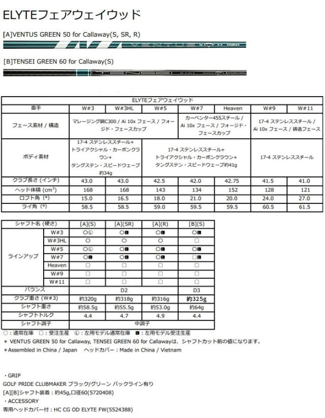 キャロウェイ ELYTE フェアウェイウッド VENTUS GREEN 50/TENSEI GREEN 60 for Callaway カーボンシャフト 2025年モデル[日本仕様][Callaway][エリート]