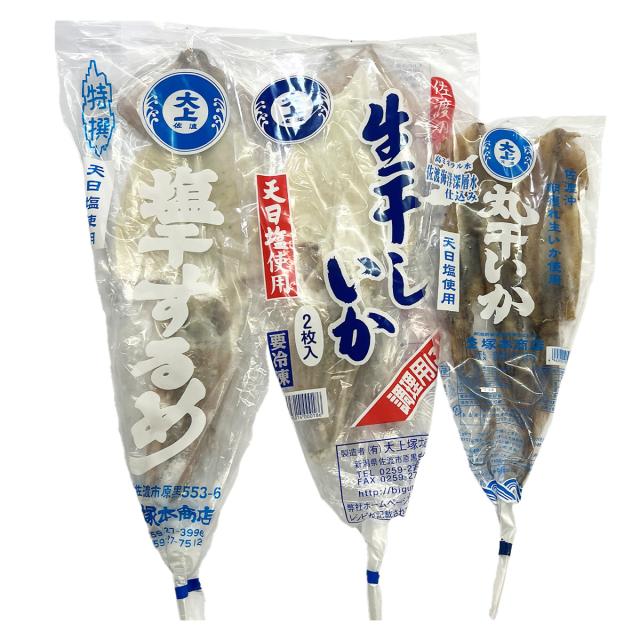 「佐渡 天日塩使用 イカづくし 3種 詰め合わせ」は、塩干するめ、生干しいか、丸干いかのセットです。ご飯のおかず、おつまみ、お酒のお供などにおすすめです。