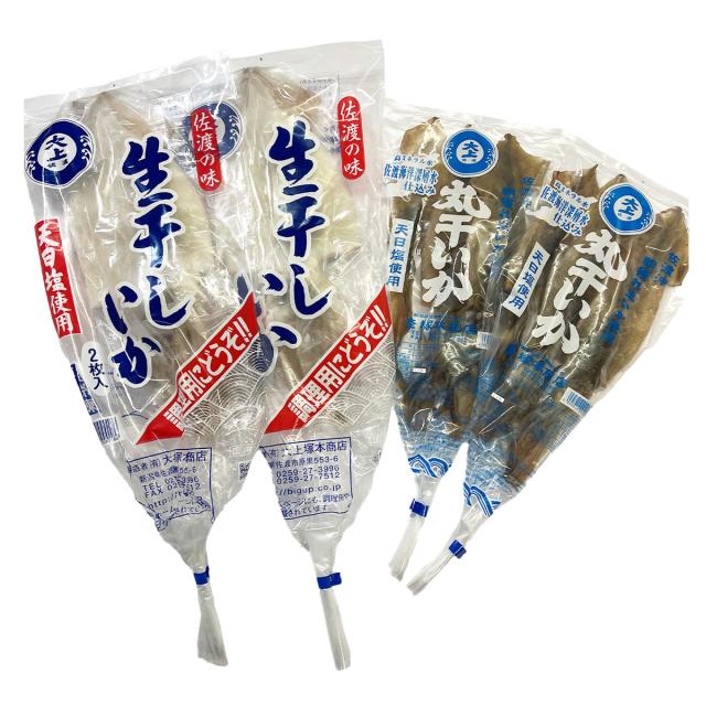 「佐渡 天日塩使用 イカづくし 2種 詰め合わせ」は、生干しいか、丸干いかのセットです。ご飯のおかず、おつまみ、お酒のお供などにおすすめです。