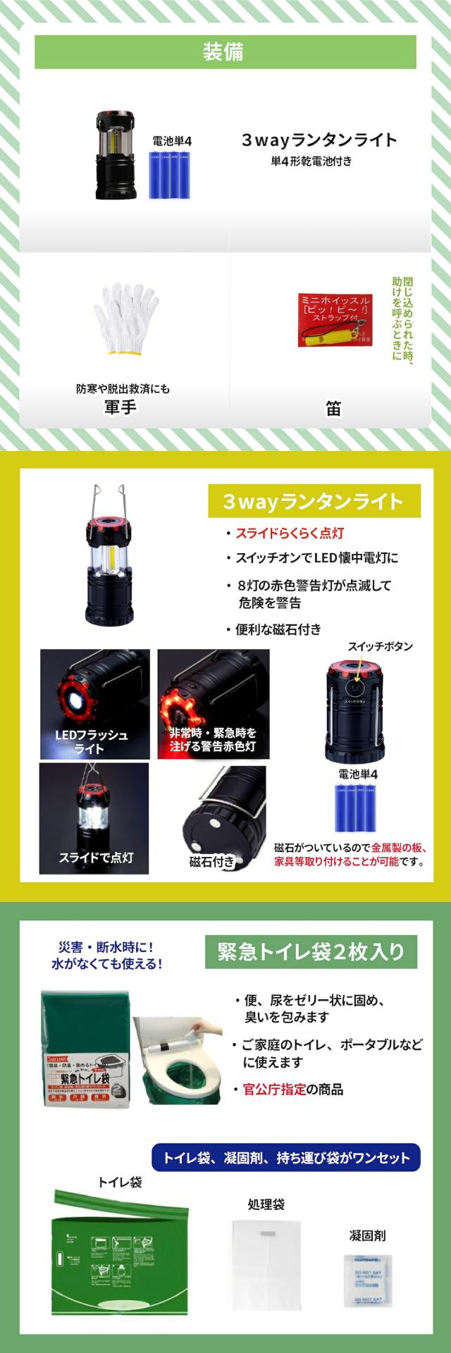 地震が発生した直後からスグにご使用いただける商品セットです。量より質にこだわり、最低限必要な防災グッズをセットにしました。
