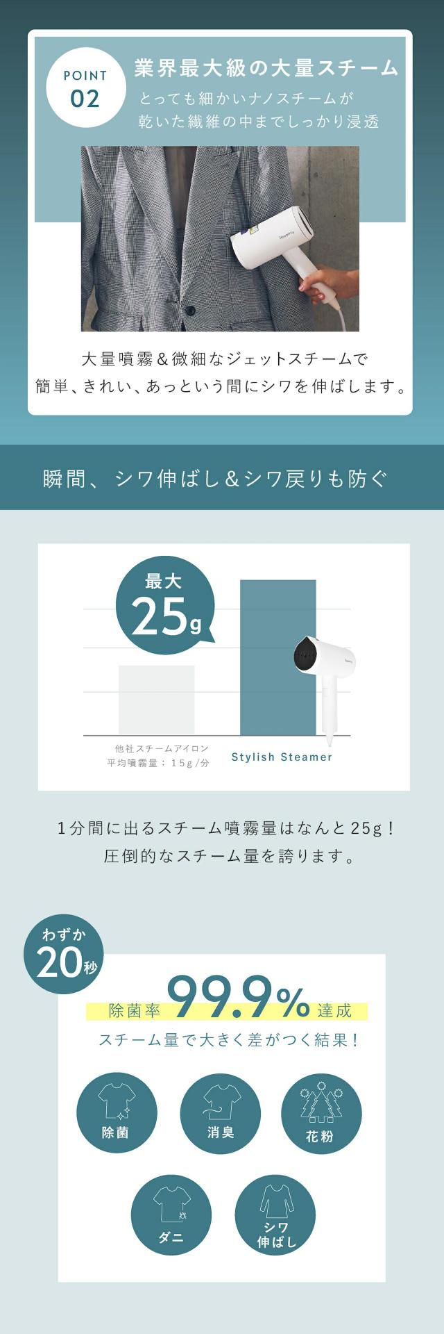 菌は、水分存在下で加熱することで効果的に死滅させることができます。Stylish Steamerのスチームは、除菌に最適な100℃以上の高温水蒸気。マスクをはじめ、あらゆる布製品の除菌が可能です。?