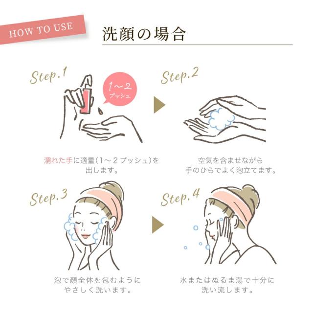 | 使用方法 | 適量を手にとり、メイクとなじませてください。 水またはぬるま湯を顔全体になじませ、泡立てた後きれいに洗い流してください。 |
