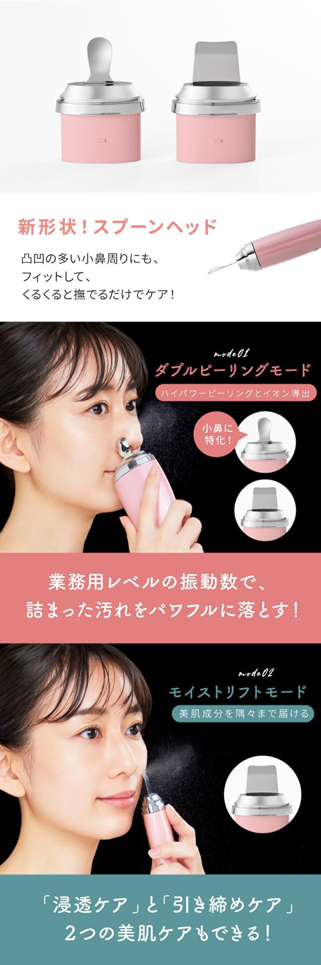 さらに凄いのは小鼻に特化したスプーンヘッドを付けたこと。小鼻の凸凹にフィットして、酸化して固まった状態の汚れも溶かして、吹き飛ばします。