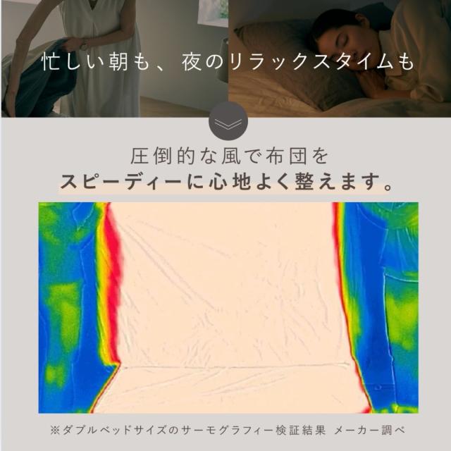 | 備考 | ・羊毛、羽毛、綿、化学繊維などの布団乾燥、あたためが可能です。 ・シーツや布団カバーを付けたままでも乾燥、あたためができます。 ・布団の耐熱温度が70度以上であることをご確認のうえ使用してください。特に機能性寝具( 低反発や高反発素材、ビーズ素材、パイプまくら等 )は温風の温度により機能を損なうことがあります。ご使用前に必ず寝具メーカーからの情報をご確認ください。 |