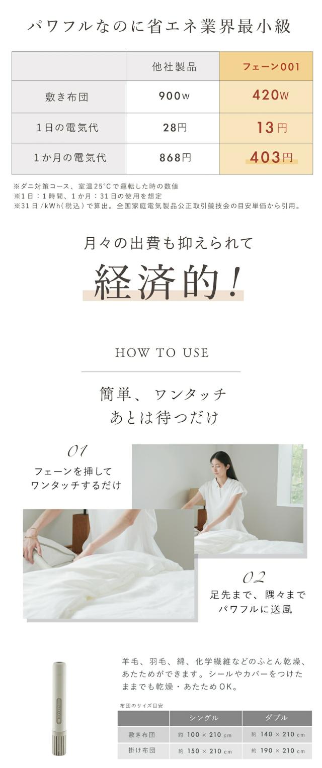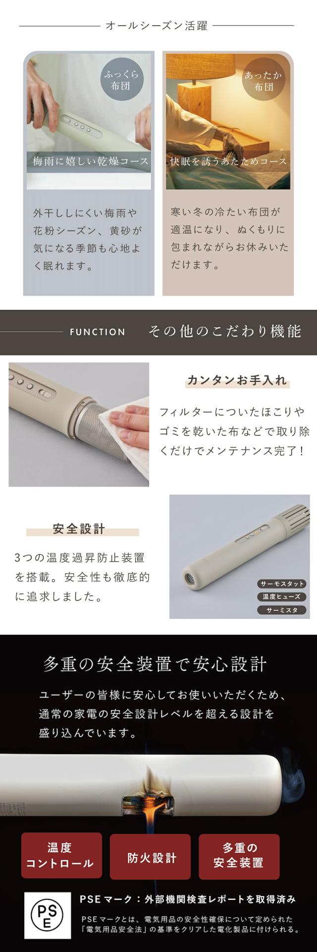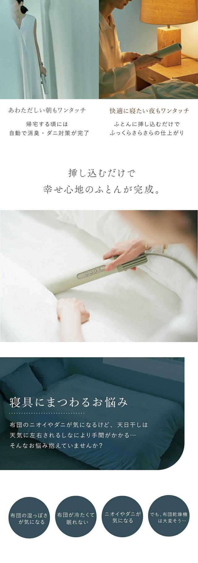 小型軽量、出しっぱなしにできる美しいデザインの布団乾燥機。面倒な準備・片付け不要、挿し込むだけで幸せ心地のふとんが完成。ダニ退治や消臭も可能です。
