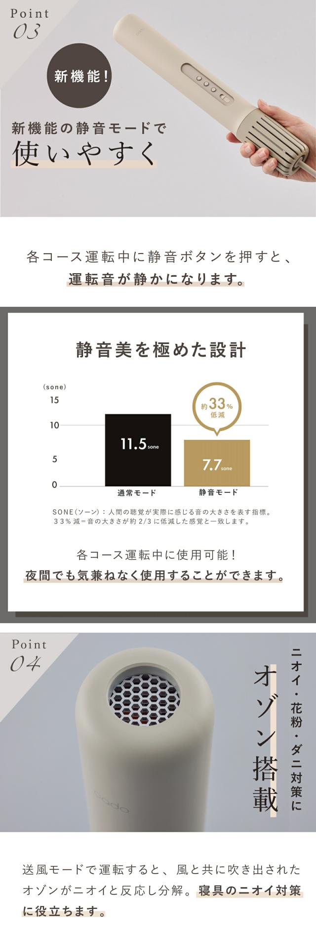 布団あたためやダニ対策、オゾン消臭など従来の機能はそのままに、運転音を抑える「静音モード」が新たに搭載!