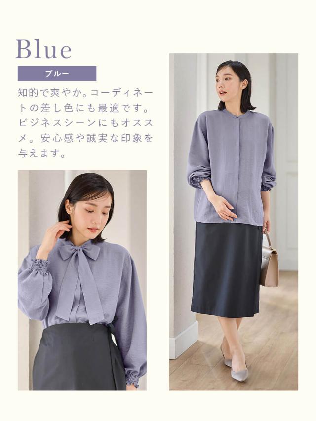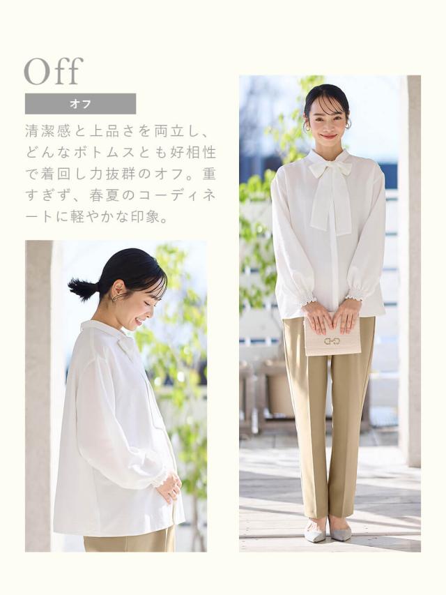 通勤コーデから入園式などのフォーマルスタイルまで、幅広く使えるブラウスです。取り外し可能なボウタイのアレンジで、かっこよくもエレガントにも着まわせます。表面感のある高見え生地は、汗をかいても肌に張り付きにくく、さらりとした着心地。フロントが開くので授乳もしやすいです。