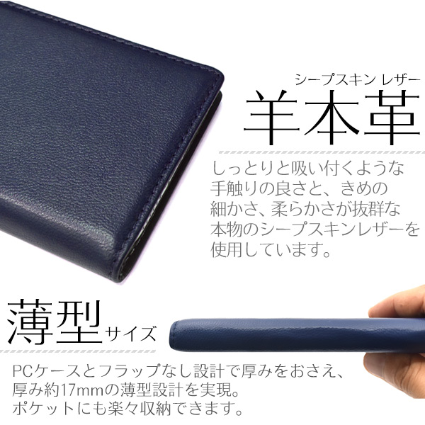 | 高級感あふれるシープスキンレザーを使用した、シープスキンレザー手帳型ケース。 しっとりと吸い付くような手触りの良さと、きめの細かさ、柔らかさが抜群な 本物のシープスキンレザーを使用しています。 背面を折り返すとスタンドとして使用できるので、動画視聴に便利です。 横開きタイプなので、手帳のように使うことができます。 また、内側には収納しやすい縦型のカードポケットが付いています。 フラップがない、マグネット内蔵タイプなので開閉が簡単です。 内部ケースはハードケースなのでしっかりとスマートフォンを固定できます。 PCケース採用とフラップなし設計で厚みをおさえ、 厚み約17mmの薄型サイズを実現。ポケットにも楽々収納できます。 | ||||||||||||||