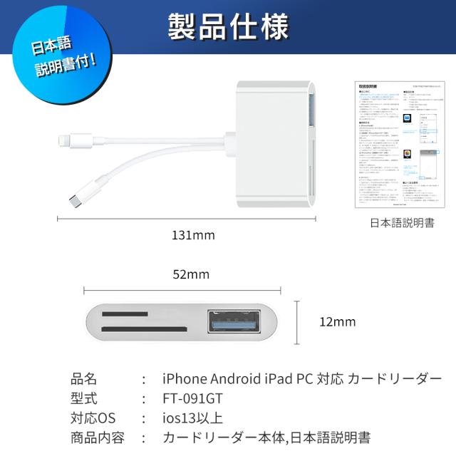 接続:Lightning(ライトニング)/ Type-C セット内容:カードリーダー本体、日本語説明書 |